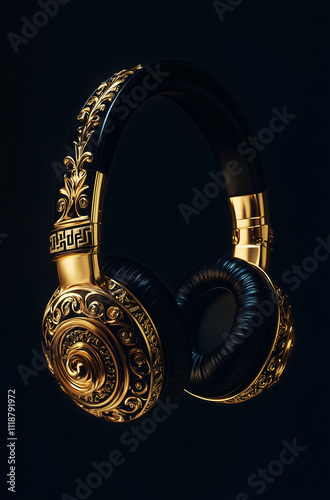 Hyper-realistic headphones made of black and gold, featuring intricate details and decorated with carvings in a Greek style.