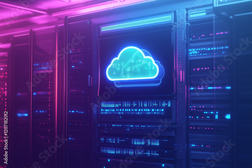 Icon cloud in server room, Abstract concept of cloud computing, symbolizing the connection technology.