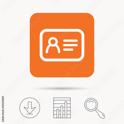 ID card icon. Personal identification document symbol. Report chart, download and magnifier search signs. Orange square button with web icon. Vector