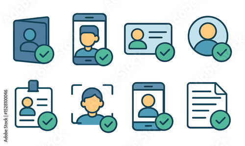 Identity Verification Concept isometric set. Passport checkmark, selfie verification, personal ID with tick, verified profile, digital ID badge, face scan