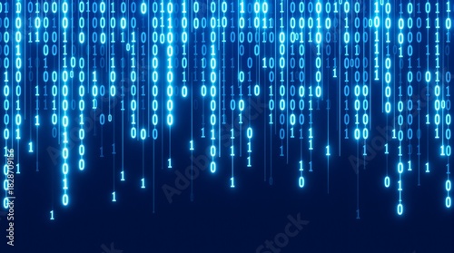 Illuminated blue binary code cascading down a dark background creating a digital matrix effect
