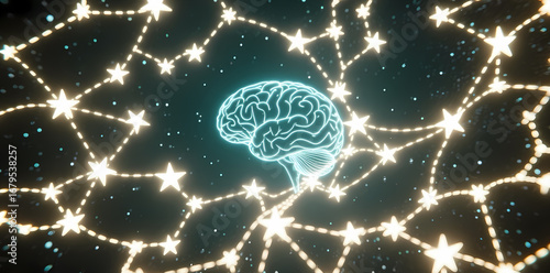 Illuminated brain surrounded by interconnected starry lines against a dark background