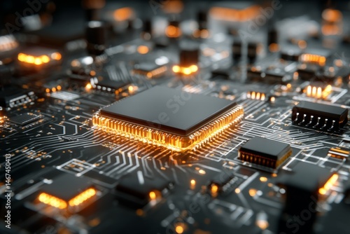 Illuminated Central Processing Unit on Circuit Board with Electrical Components for Computing and Technology Industry