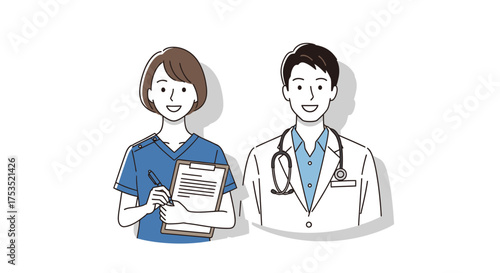 Illustration of a doctor and a nurse standing side by side smiling.