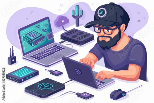 Illustration of a hacker using laptops and multiple devices, representing cybersecurity, hacking activities, and digital security challenges in a dark and intense setting