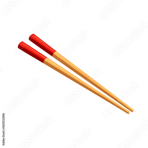 Illustration of a pair of wooden chopsticks with red painted tips, food utensil, Asian cuisine.