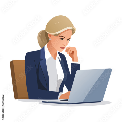 Illustration of a person in front of a computer. Flat design, soft color palette.