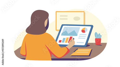 Illustration of a woman analyzing charts and graphs on a tablet at a desk with a plant and documents