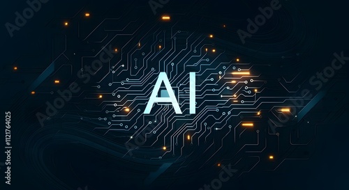 Illustration of an abstract futuristic background with digital technology and artificial intelligence concepts. The text "AI".