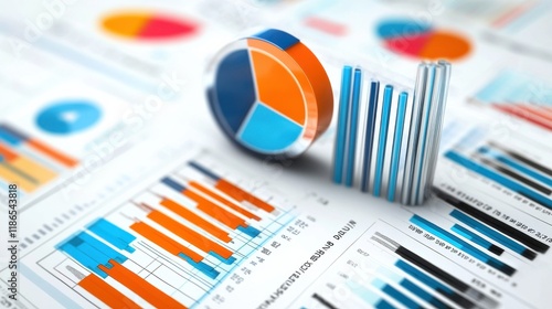 Illustration of business analytics with charts, graphs, and financial data on a white background. illustration