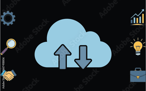 Illustration of cloud computing with data transfer, analytics, and business icons for technology solutions