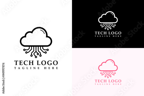 illustration of cloud with digital node roots below, vector logo for machine learning, cloud computing, internet of things, artificial intelligence, database, blockchain, tech, and more
