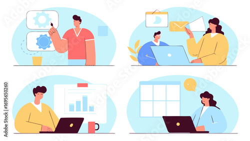 Illustration of diverse business people collaborating on various tasks in a modern office setting. Shows teamwork, communication, and productivity.