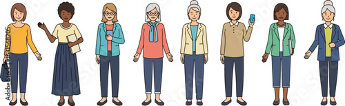 Illustration of diverse women standing in a row wearing casual business attire on a white background