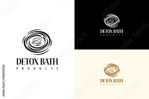 illustration of water ripple with a soft leaf floating inside, vector logo for detox bath, natural bath, calming, detox body care, spa products, organic, detox bath products, and more