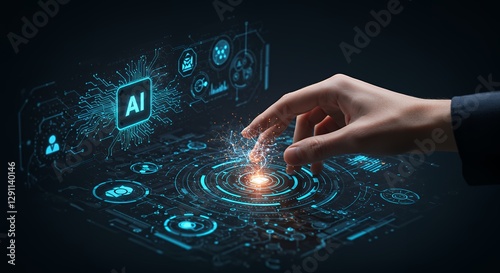 Illustration representing AI and machine learning applications, with neural networks, algorithmic models, and predictive analytics visualized in a digital interface.