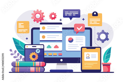 Illustration showcasing application programming interface concepts with digital devices and graphic elements emphasizing data flow and interaction design