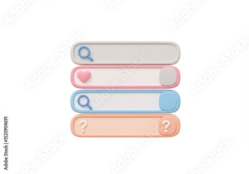 Illustrations of search bars with magnifying glass, heart, and question mark isolated on white background