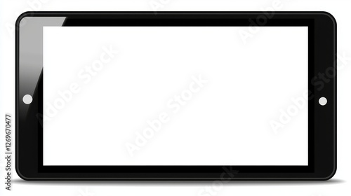 Image of a contemporary black tablet computer displaying a blank screen in a horizontal orientation, set against a plain white backdrop, in PNG format
