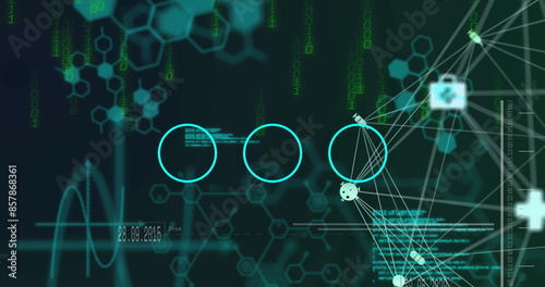 Image of abstract spring shape and binary coding against medical data processing