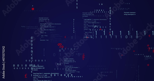 Image of binary coding data processing and symbols floating against blue background