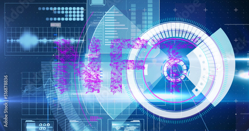 Image of digital interface with scan scoping and nft text over blue background