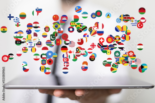 Image of diverse flags on a tablet, representing global networking and international business.