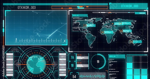 Image of interface with spinning globe, world map and data processing on blue background