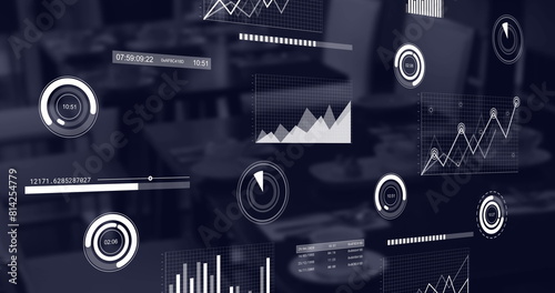 Image of loading circles, multiple graphs and timer over place setting on dining table