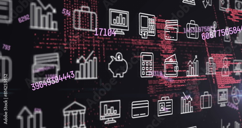 Image of multiple changing numbers and digital icons over data processing and light spot