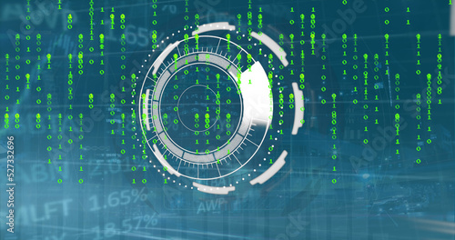 Image of scope scanning with interface, binary codes, graphs moving over trading board