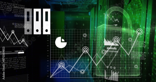 Image of security padlock icon and data processing against computer server room