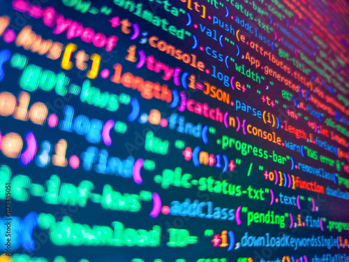 Image of statistics and financial data processing over black background. Software code or script abstract background with numbers. Binary code computer language data transfers. Blue php.