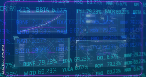 Image of stock market over data processing on blue background
