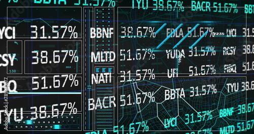 Image of trading board over lines, circles, keyboard, navigation pattern over black background
