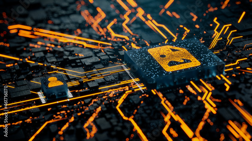 Image Technology Concept with picture symbol on a Microchip. Orange Neon Data flows between the CPU and the User across a Futuristic Motherboard. 3D render.