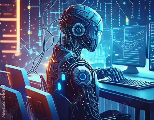 images of humanoids with AI connecting to the network to process computer data