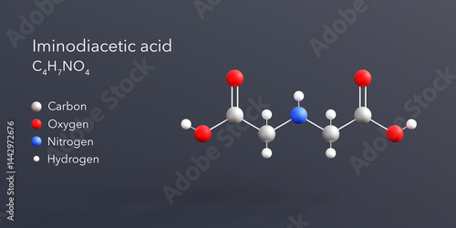 iminodiacetic acid molecule 3d rendering, flat molecular structure with chemical formula and atoms color coding