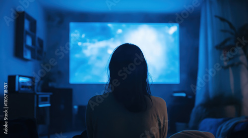 Immersion defines a cozy living room where a viewer is captivated by the glow of a large screen, enveloped in an atmosphere of suspense and wonder.