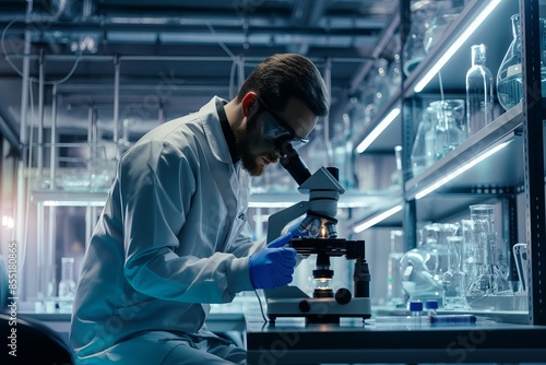 In a dimly lit lab, a focused scientist in glasses and lab coat examines samples using a high-tech microscope