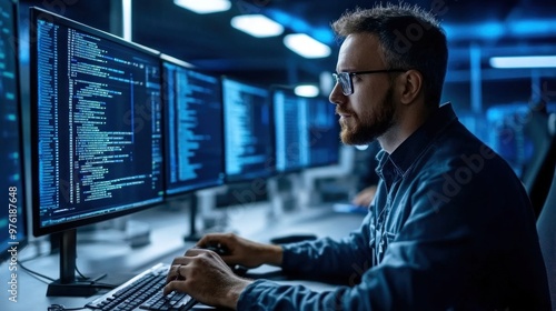 In a high-tech office, a man intently types on a keyboard while analyzing code displayed on several computer monitors. The ambient lighting creates a concentrated atmosphere for programming