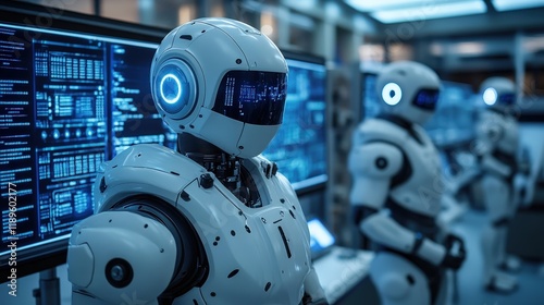 In a high-tech robotics lab, humanoid robots stand in front of multiple display screens filled with data and coding. Engineers observe and interact with these advanced machines