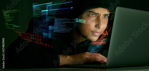 Indian woman, hacker and code overlay of banking and credit card fraud with coding graphic. Programmer, criminal and finance software hack with a hacking expert writing algorithm for cybercrime virus
