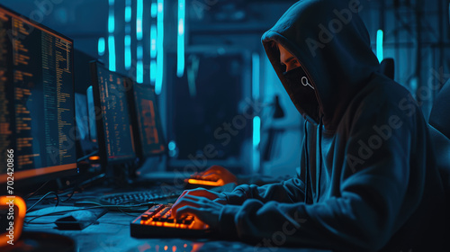 Individual in a hoodie engrossed in work at a computer workstation with multiple screens displaying coding and data analysis, set against a backdrop of glowing red and orange digital graphics