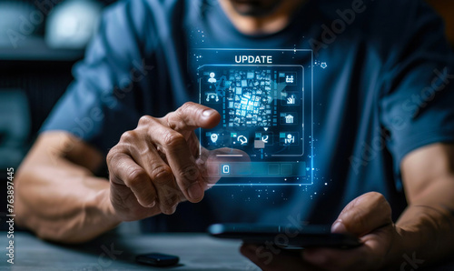 Individual Interacting with Smartphone During Software Update Process Displayed Through Augmented Reality Interface