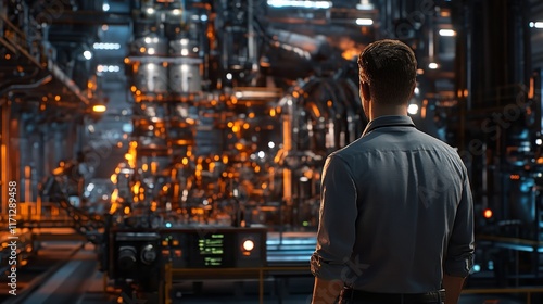 Industrial Construction Worker at Night Site with Blurred Lighting and Transportation Equipment