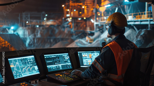Industrial engineer working at computer control panel monitoring mining process at night