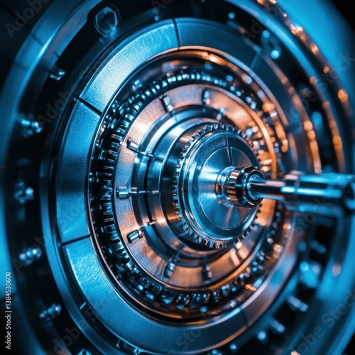 Industrial Machinery's: A close-up view of intricate machinery with gears and metal components, bathed in cool blue and warm orange tones