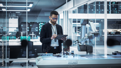 Industrial Robotics Professional Interacting with Robotic Arm During a Research Phase in a High Tech Startup. Scientist Uses Tablet Computer to Manipulate and Program the Robot to Move a Microchip.