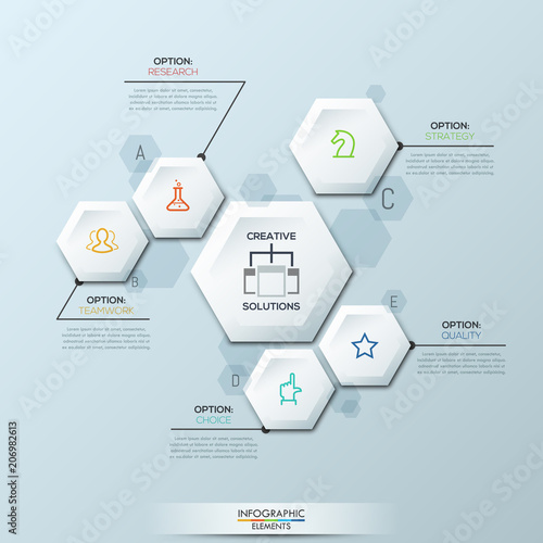 Infographic design template with 6 separate white hexagonal elements